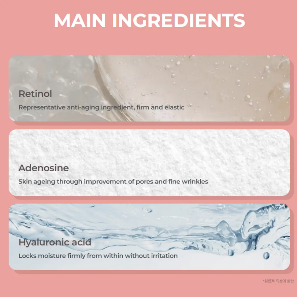 Water, Butylene Glycol, Glycerin, Cetyl Ethylhexanoate, 1,2-Hexanediol, Octocrylene, Niacinamide, Pentaerythrityl Tetraisostearate, Glyceryl Stearate, Polysorbate 60, Peg-100 Stearate, Sorbitan Sesquioleate, Cetearyl Alcohol, Tromethamine, Carbomer, Caprylic/Capric Triglyceride, Macadamia Ternifolia Seed Oil, Retinol(960 Ppm), Alcohol, Propylene Glycol, Hydrogenated Lecithin, Polysorbate 20, Allantoin, Xanthan Gum, Adenosine, Cholesterol, PEG-5 Rapeseed Sterol, Brassica Campestris (Rapeseed) Sterols, Ceteth-3, Ceteth-5, Tocopheryl Acetate, Cetyl Phosphate, Coptis Japonica Root Extract, Ethylhexylglycerin, Disodium Edta, BHT