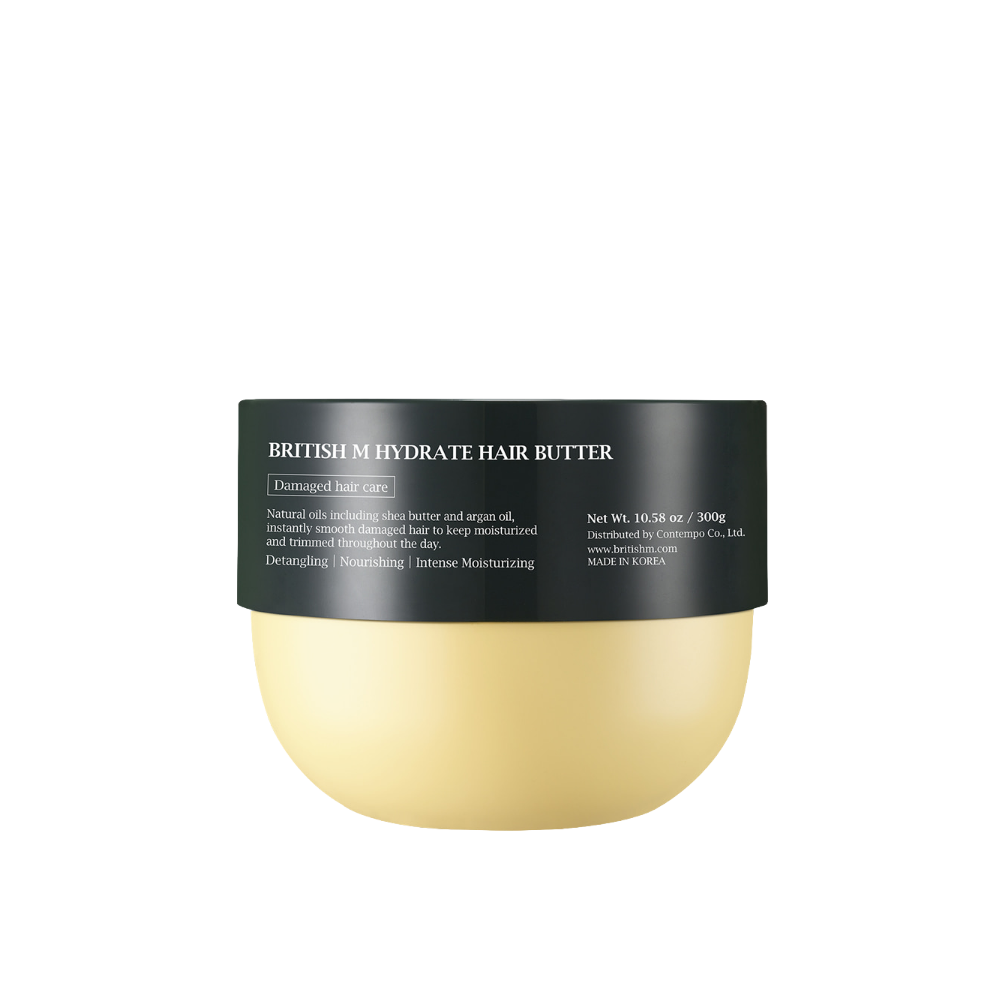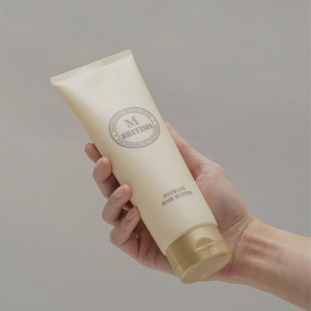 British MÂ Hydrate Hair Butter will instantly make your hair luscious and soft. The perfect solution to revive brittle and damaged hair. The hair butter is infused with collagen to improve elasticity and restore any damage. Shea butter and argan oil nourish the hair and moisturize dry strands. Your hair will feel more manageable and healthy, with a luxurious silky feel. The butter can be used as a deep treatment for the hair instead of a conditioner, or as a leave-in to treat damaged hair.