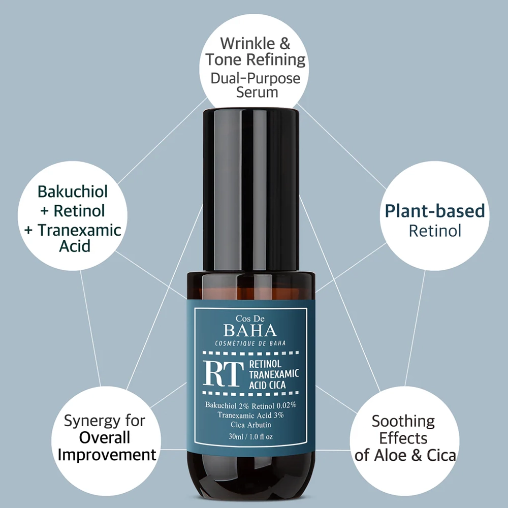 Cos De BAHA RT Retinol Tranexamic Serum brightens skin, improves texture, and evens tone while hydrating and soothing. Read more