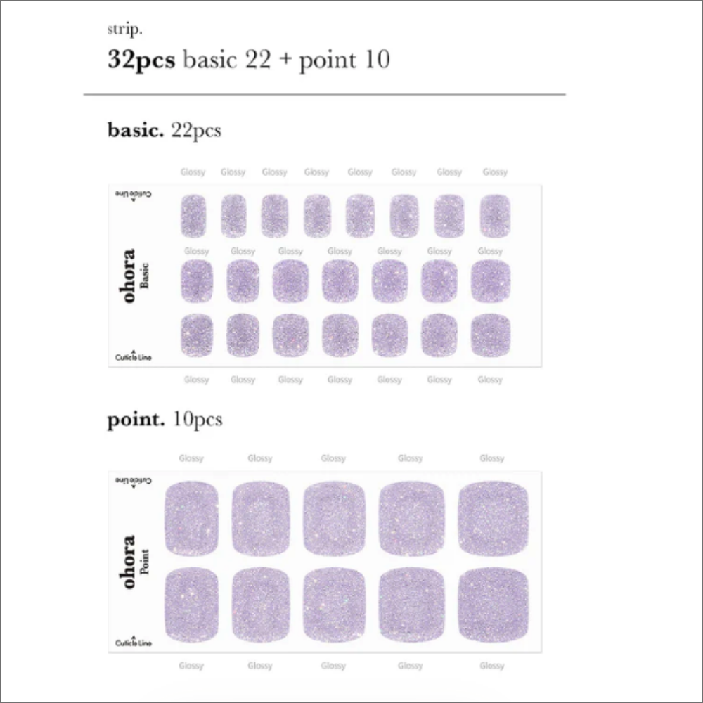Add a touch of innocence and brilliance with Ohora P Blueberry Pop, a gorgeous light purple glitter pedicure. Part of a charming collection released in white, pink, blue, and purple versions, this design features a dazzling opal shimmer that looks as if it’s been polished with jewels. With Ohora Semi Cured Gel Pedicure Strips, enjoy a salon-quality pedicure at home. The unique C-curve design fits perfectly to the natural shape of your toenails.
