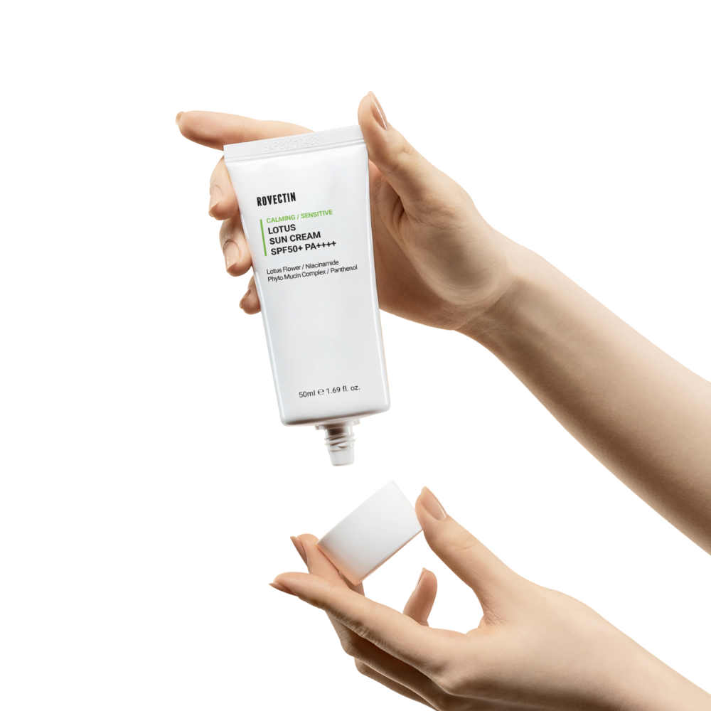 Rovectin Calming Lotus Sun Cream SPF50+ PA++++ is a high-protection sunscreen designed for daily use while keeping the skin hydrated and comfortable. The formula combines advanced chemical UV filters with soothing and skin-supporting ingredients to protect the skin from UVA and UVB exposure without feeling heavy.