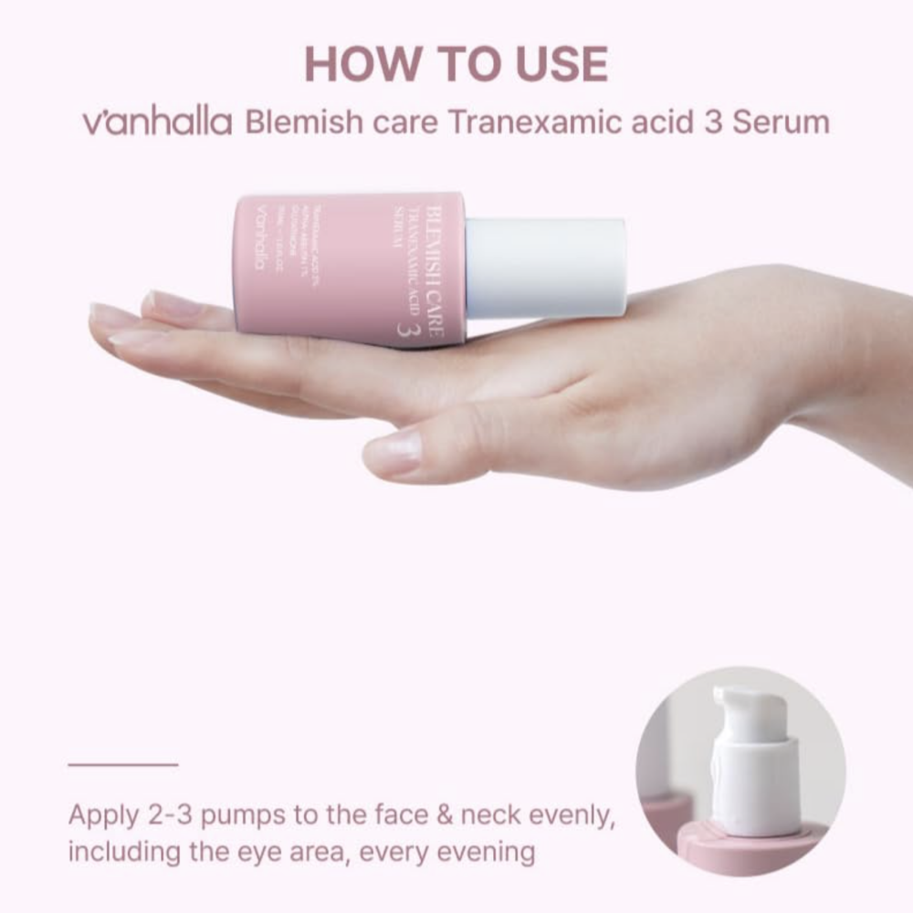 The V’anhalla Blemish Care Tranexamic Acid 3 Serum is designed to target pigmentation, blemishes, and uneven skin tone. With 3% tranexamic acid and brightening ingredients like niacinamide and alpha-arbutin, this vegan serum helps refresh the complexion and fade dark spots. The lightweight texture absorbs quickly and feels comfortable on the skin.