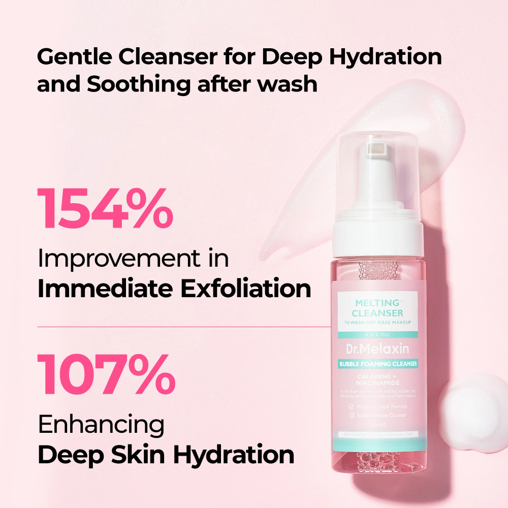 Ervaar de ultieme reiniging met de Dr.Melaxin Melting Cleanser, een innovatieve schuimreiniger die make-up, overtollig talg en onzuiverheden moeiteloos verwijdert in één eenvoudige stap. Dankzij het geavanceerde Makeup Melting System barsten micellaire waterbelletjes open zodra ze de huid raken, waardoor zelfs hardnekkige resten volledig oplossen zonder de huid te irriteren. De olievrije formule reinigt diep in de poriën en laat de huid schoon, fris en gehydrateerd aanvoelen.