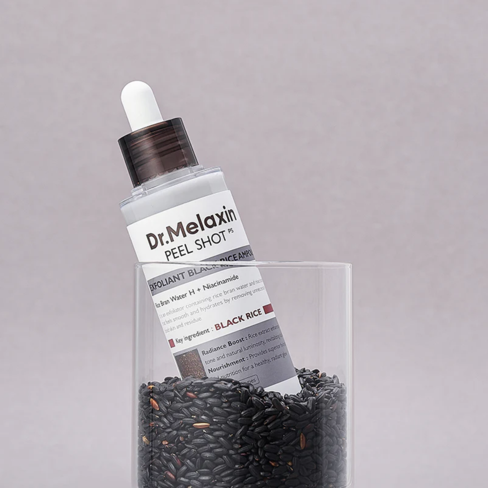 Dr.Melaxin Peel Shot Exfoliant Black Rice Ampoule is een krachtige maar milde exfoliërende ampoule die de huid vernieuwt en verfijnt. Deze 4-in-1 formule verwijdert dode huidcellen, blackheads en whiteheads, reinigt de poriën diep en stimuleert een gladde, egale huidstructuur. De formule helpt overtollig talg te verminderen, verbetert de helderheid van de huid en ondersteunt de natuurlijke glow zonder irritatie. Tegelijkertijd wordt de huid intens gehydrateerd en voelt ze zacht, fris en comfortabel aan.