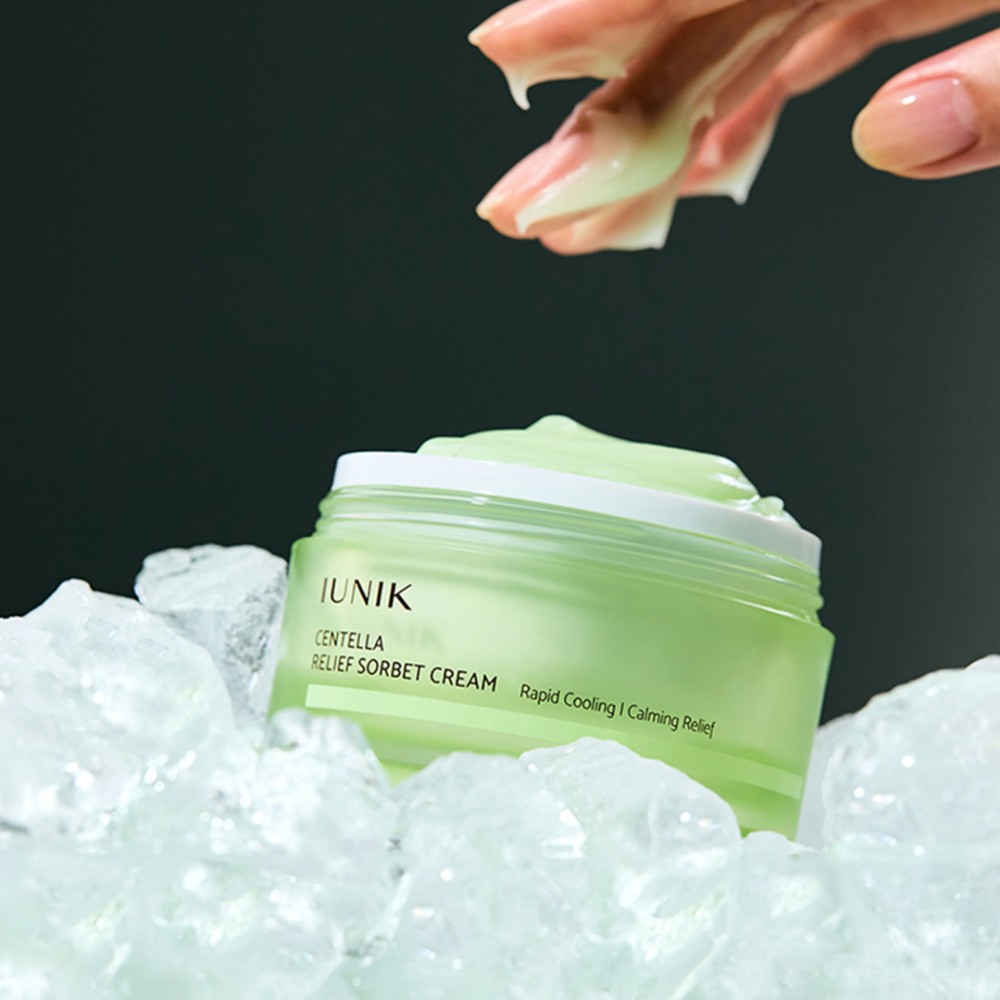 iUNIK Centella Relief Sorbet Cream is een kalmerende gezichtscrème met een verkoelend effect die de gevoelige huid helpt verzachten en intens hydrateert. Deze rijkere, meer hydraterende variant van de Centella Calming Gel Cream heeft een sorbetachtige textuur die smelt op de huid, helpt huidwarmte te verminderen en de vochtbalans en huidbarrière ondersteunt.