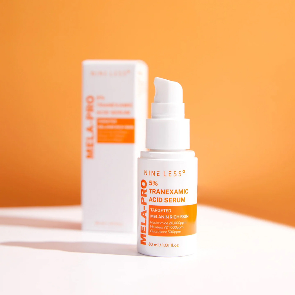 Het Nine Less MELA-PRO 5% Tranexamic Acid serum bevat 5% Tranexamic Acid, 2% Niacinamide en Glutathion om de huidtint te verhelderen, pigmentatie te verminderen en poriën te minimaliseren. Het bevat ook hyaluronzuur en glycerine voor een diepe hydratatie en vermindering van roodheid, met een lichtgewicht textuur die zorgt voor een snelle absorptie.
