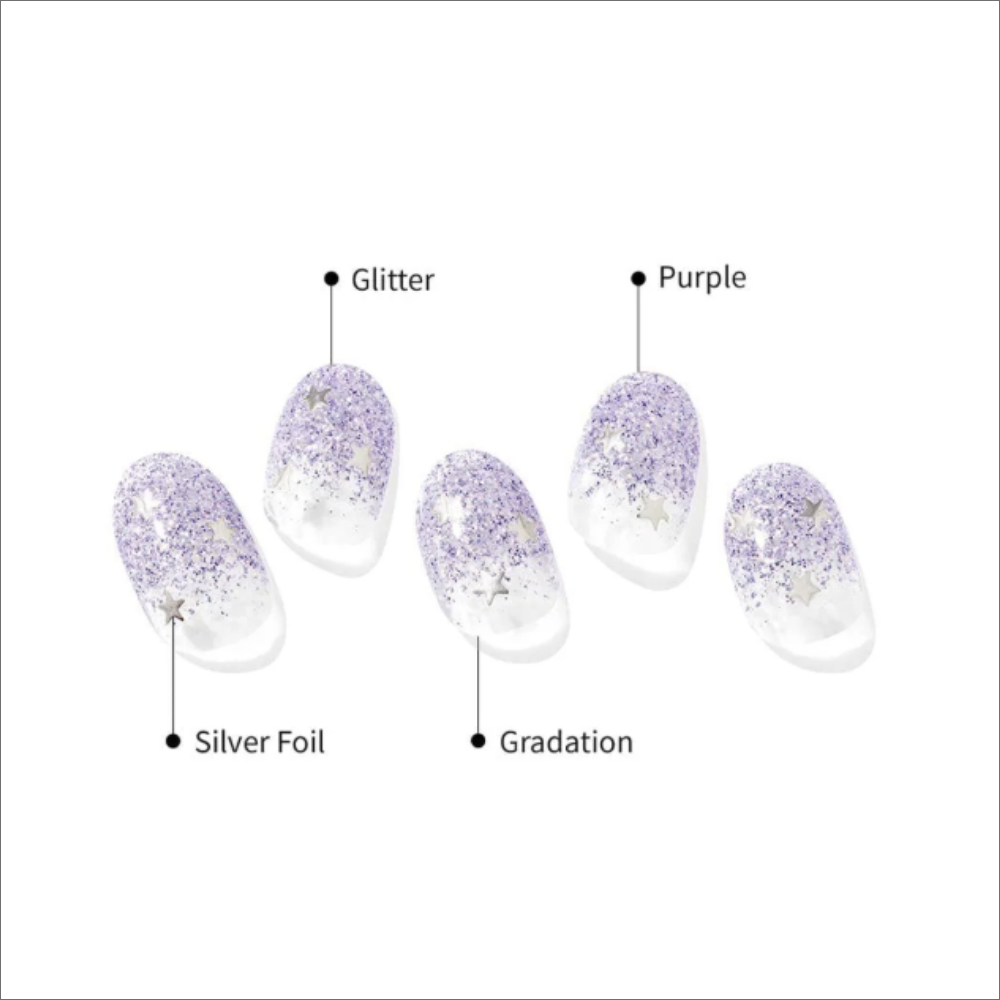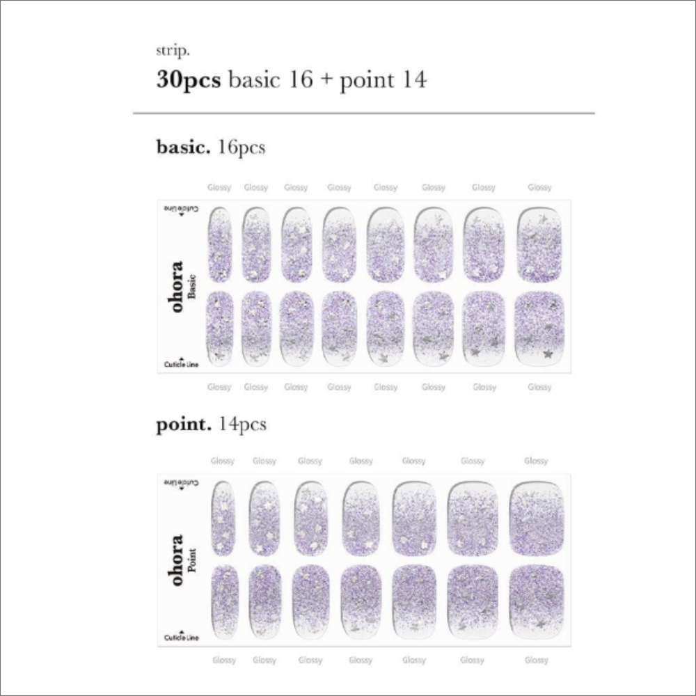 Droom weg met Ohora N Shooting Star, een betoverend ontwerp met een lichte lila glans, versierd met sprankelende sterretjes. Deze subtiel glitterende gelnagelstickers zorgen voor een zachte, dromerige look die perfect is voor elke gelegenheid – van casual tot feestelijk. Dankzij de Ohora Semi Cured Gel Nail Strips creëer je thuis moeiteloos een langdurige en comfortabele gelmanicure van salonkwaliteit. Het unieke C-curve ontwerp sluit naadloos aan op het nagelbed voor een perfecte pasvorm.