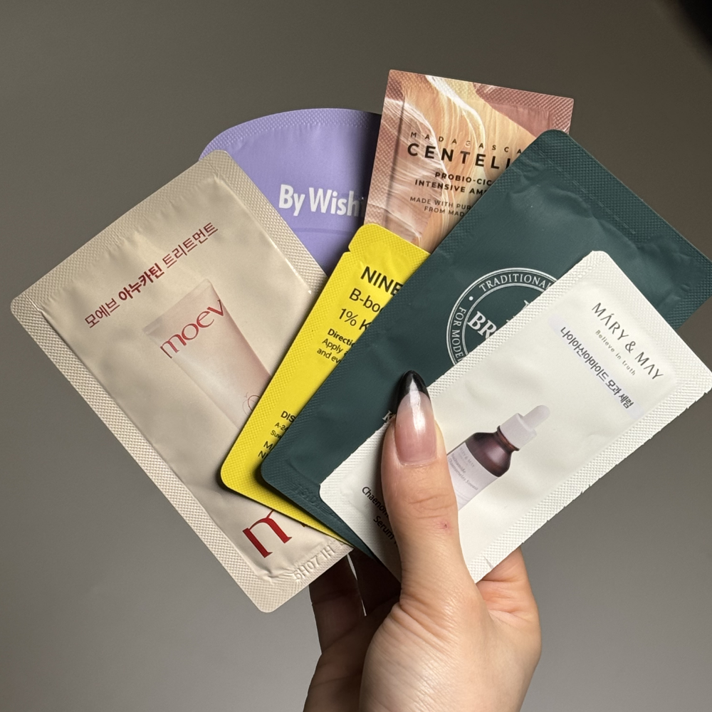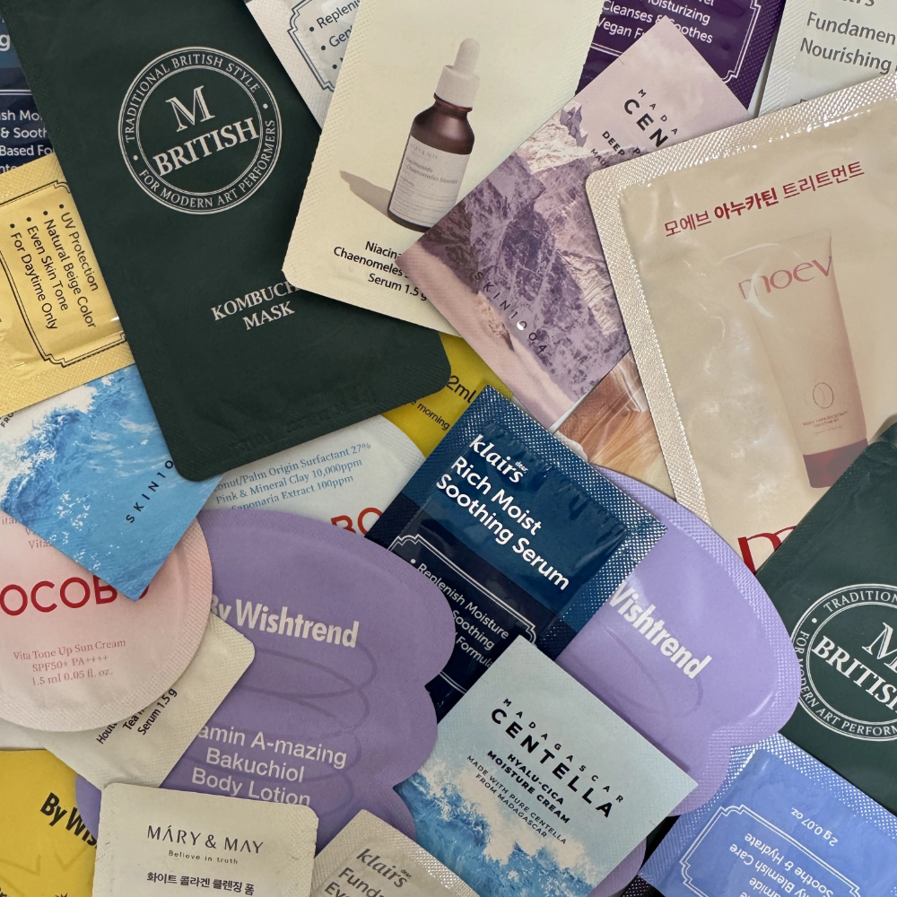 Afbeelding is uitsluitend ter illustratie. De getoonde samples (zoals bijvoorbeeld Klairs, Mary & May, SKIN1004, British M en Wishtrend) dienen alleen om een indruk te geven van het type samples dat kan worden ontvangen.