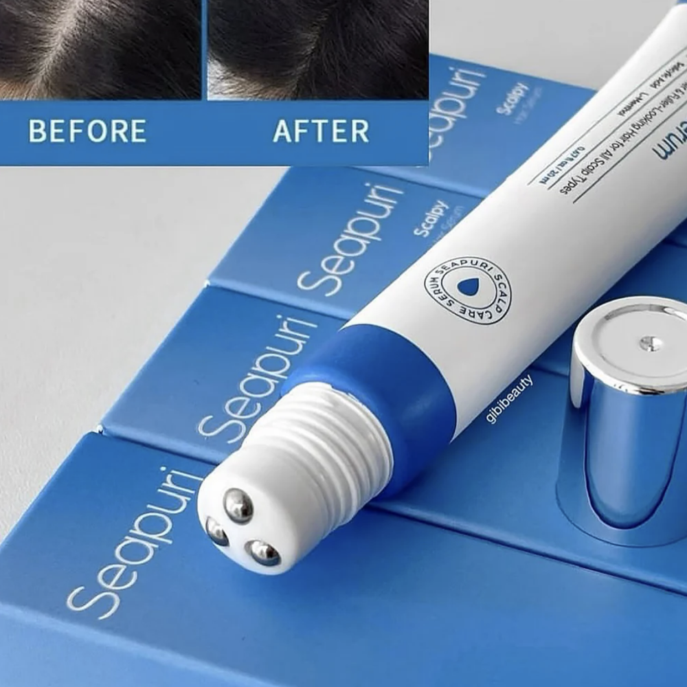 Het Seapuri Scalpy Hair Serum is een intensief hoofdhuidserum dat haaruitval vermindert en de haarwortels versterkt. De koelende metalen roller stimuleert de doorbloeding en helpt actieve ingrediënten beter opnemen, terwijl salicylzuur, panthenol en menthol de hoofdhuid kalmeren en verfrissen.