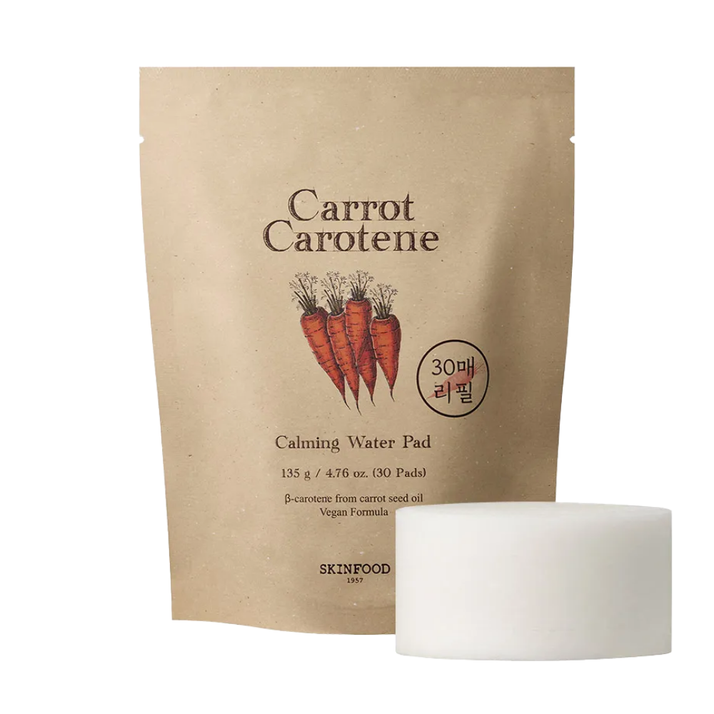Skinfood Carrot Carotene Calming Water Pad biedt kalmerende verlichting aan de huid. De toner pads bevatten boordevol wortelextract en wortelzaadolie die rijk zijn aan bètacaroteen en antioxidanten zodat de huid word gehydrateerd en de oververhitte of overgevoelige huid word gekalmeerd. Het dikke wattenschijfje heeft een zachte wafelstructuur om wrijving te minimaliseren en glijdt zachtjes over de huid.