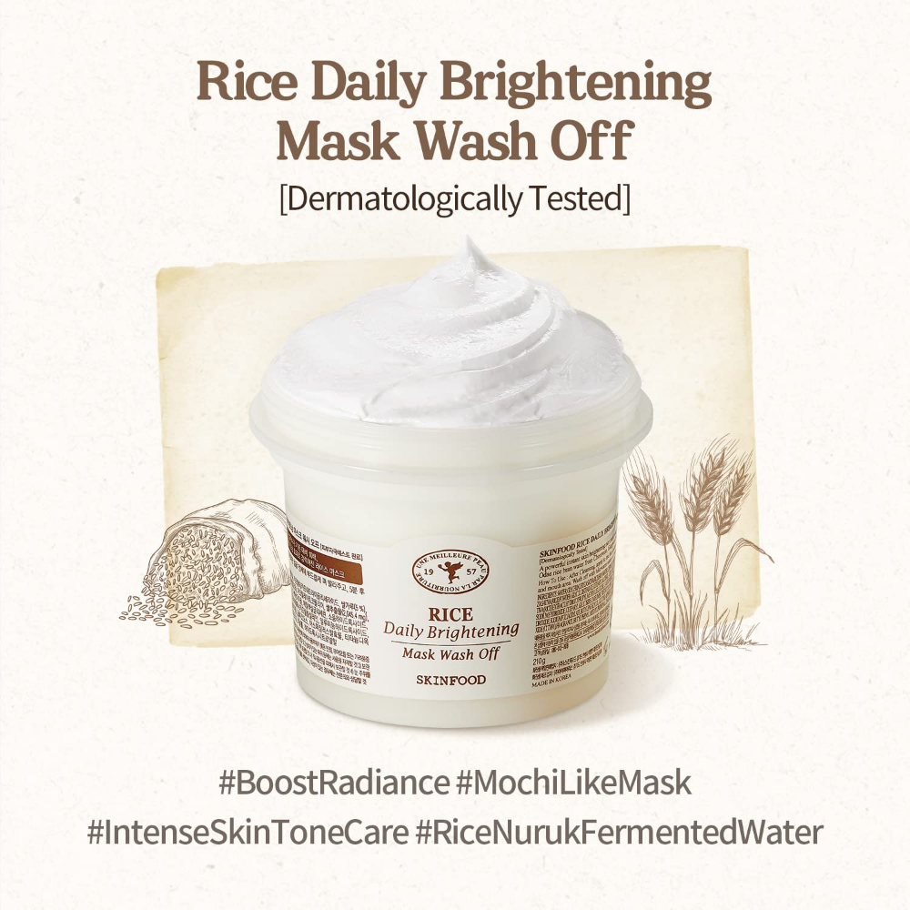 Skinfood Rice Daily Brightening Mask Wash Off is een verhelderend wash-off masker dat helpt om een doffe huid weer fris en stralend te laten ogen. De formule met rijstzemelenwater en gefermenteerd rijstextract ondersteunt een egalere teint, terwijl hydraterende ingrediënten de huid zacht, soepel en comfortabel houden zonder haar uit te drogen.