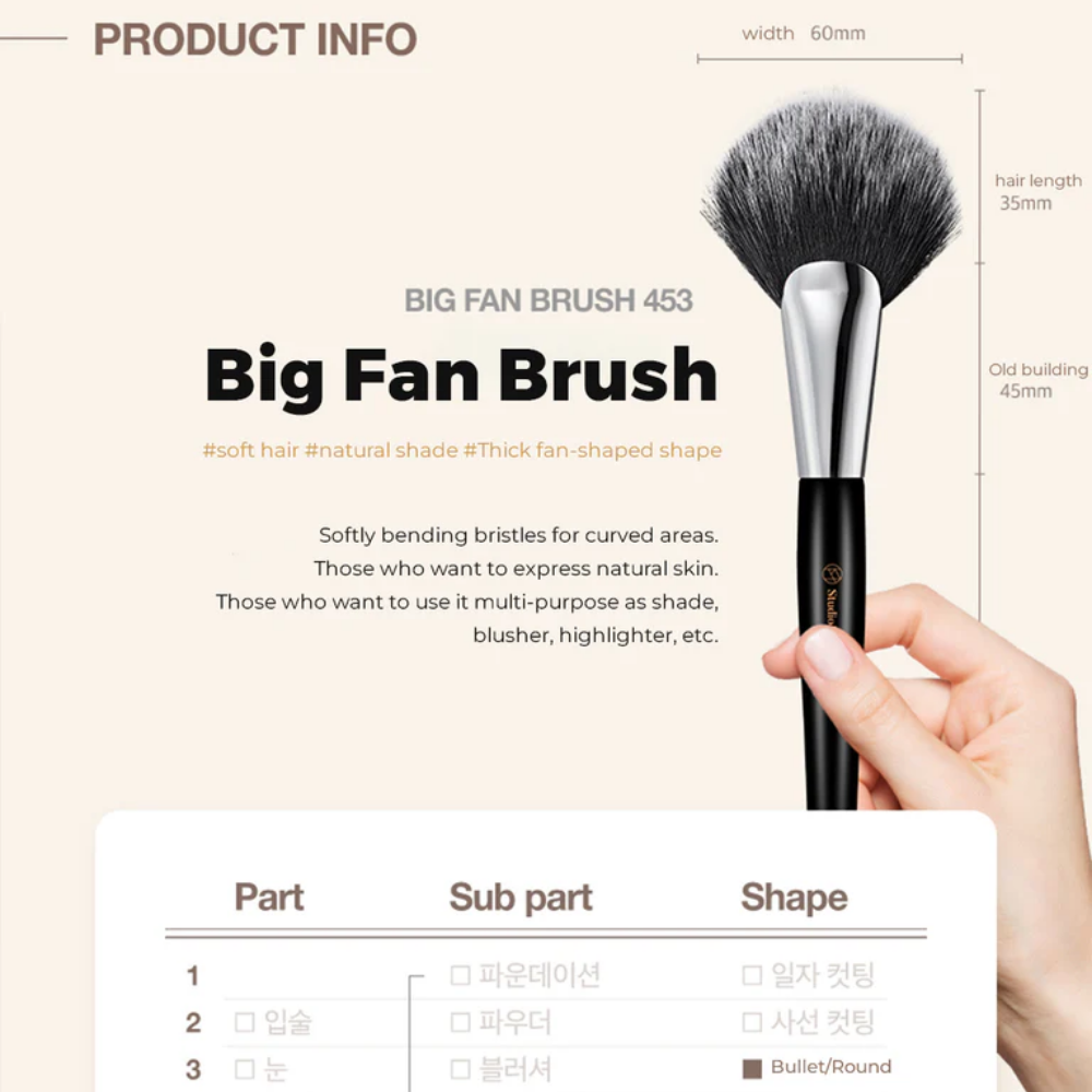 Studio 17 Big Fan Brush 453 is een veelzijdige waaierkwast voor een egale, klontvrije applicatie van poederproducten. De brede waaier-vorm en nauwkeurig gesneden synthetische haren volgen moeiteloos de gezichtscontouren, waardoor shading, blush en highlighter naadloos worden geblend op gebogen zones zoals de wangen en kaaklijn, zonder poederfallout en met een zachte aanraking op de huid.