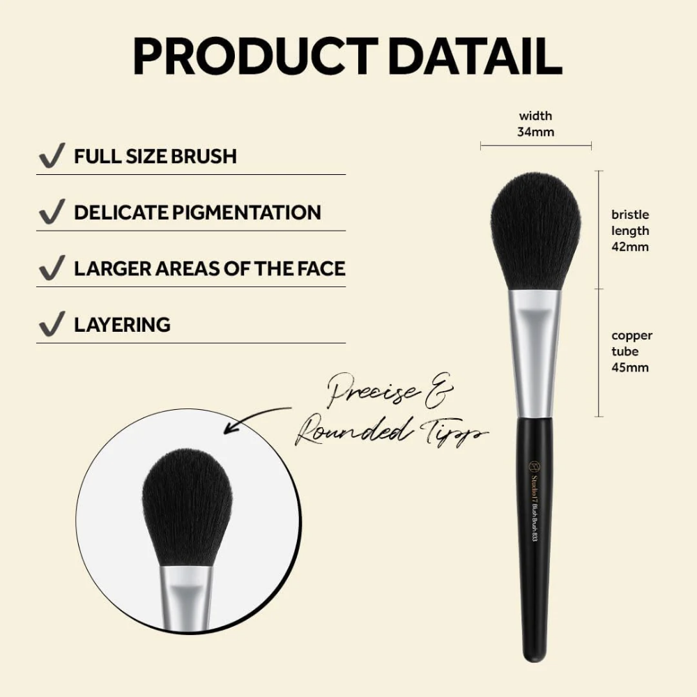 Studio 17 Blush Brush 833 is een precieze blushkwast voor een zachte, natuurlijke kleur op de appeltjes van de wangen. De kleine, afgeronde snit en hoogwaardige synthetische haren maken een subtiele, opbouwbare applicatie mogelijk met een heldere watercolor-finish, zonder poederfallout.